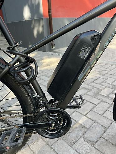 - Съёмный аккумулятор на нижней трубе рамы с замком; разъём зарядки доступен снаружи.