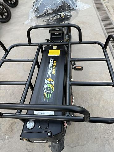 Электровелосипед/электроскутер грузовой форм‑фактора. Основные особенности: - Электромотор, привод на заднее колесо - Аккумуляторно‑батарейный блок по центру рамы - Усиленная задняя грузовая платф...
