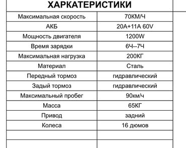 🔋Мотор: 1200 Вт 4. 🔌Запас хода: 80-90 км 🚀Скорость: 60 км/с чейин 🛞• Донголок олчому : 16/3 ✅Кучтуу мотор - тоого да, шаар ичинде да идеалдуу ☎️Байланыш: 5 0 1 1 6 0 7 0 5