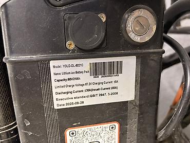 - Аккумулятор: литий-ионный, модель YDLD-DL-6021C, емкость 60V/21Ah (предельное напряжение заряда 67,2V; зарядный ток ≤5A; разрядный ток ≤30A, пусковой ≤60A). На корпусе – замок с ключом и разъем зарядки.