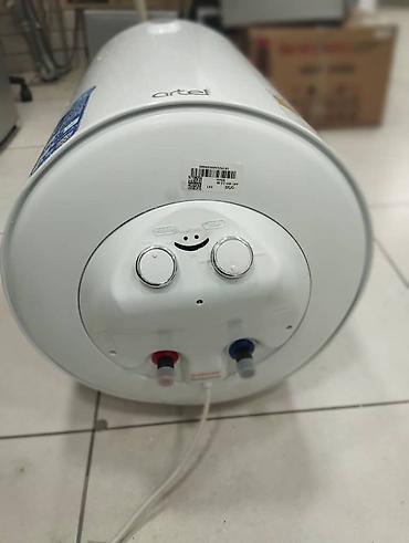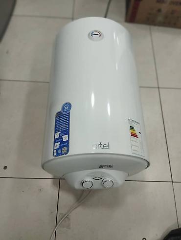 - Электрические накопительные водонагреватели: цилиндрические модели для вертикального крепления на стену. На фото — Ariston и Ortel с механическим управлением, индикатором температуры и двумя регуляторами нагрева. Подходят для квартиры, дачи, офиса. Есть защита ABS, антикоррозийное покрытие бака, магниевый анод, термостат с возможностью ручной настройки. Подключение к стандартной сети 220 В. Комплектация включает патрубки для входа/выхода воды.