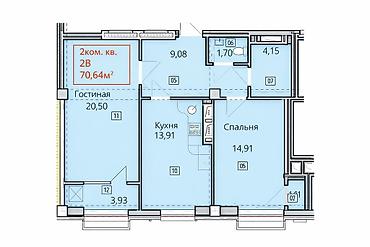Планировка 2-комнатной квартиры, тип 2В, общая площадь 70,64 м².
