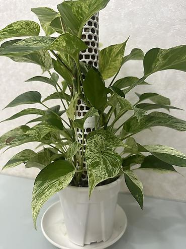 Эпипремнум (с рейтингом вариегатности: мраморно-зеленые листья) в горшке с опорой.