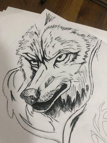 Без рамыЭскиз головы волка, выполненный черной ручкой или тонким маркером. Рисунок отличается детализированной проработкой шерсти и выразительными глазами, что придает изображению агрессивный и динамичный характер. Этот эскиз подойдет для использования в качестве иллюстрации или элемента графического дизайна.