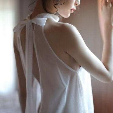 Этот пеньюар воплощает утонченность и чувственность. Полупрозрачная белая ткань придаёт образу лёгкости, а закрытое горло создаёт элегантный и сдержанный силуэт, контрастируя с полностью открытыми руками, подчёркивающими ключицы. Внешние части пеньюара украшены изящным кружевом, добавляющим романтичный акцент, а сама конструкция пеньюара невероятно прозрачная, усиливая притягательность. На шее пеньюар завязывается изящным бантиком, придавая образу мягкий и женственный штрих, а также фиксируя изделие на месте.