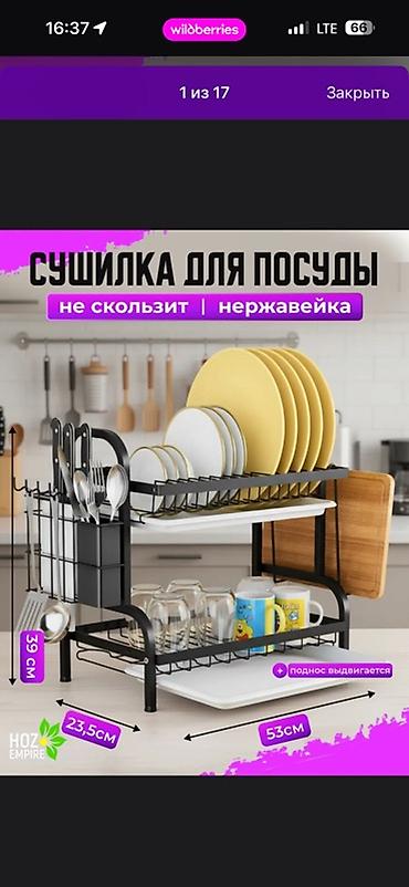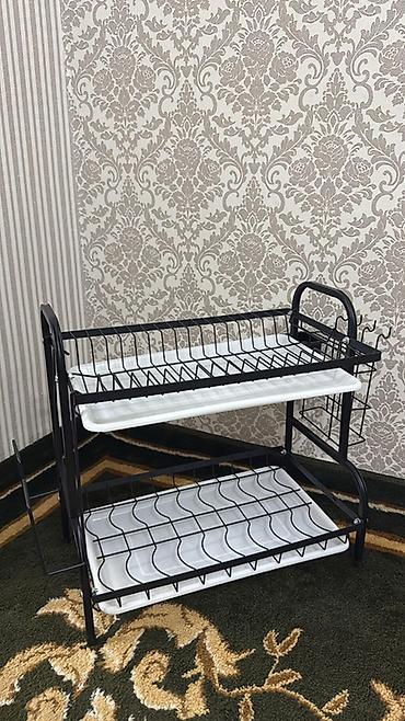 Удобная организация рабочей зоны на кухне: всё сохнет и остаётся на своих местах, вода собирается в поддоны и легко сливается. Компактный формат при хорошей вместимости. Цвет: чёрный каркас, белые поддоны.
