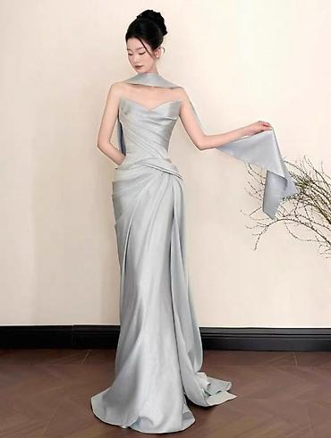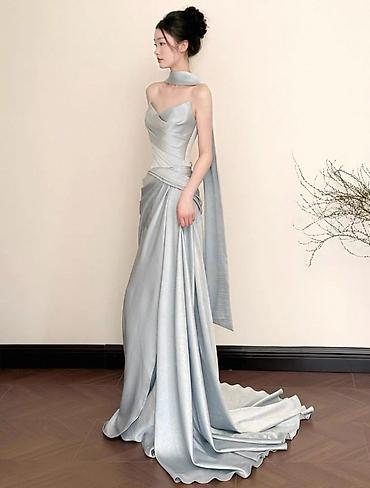 Вечернее платье, Длинная модель, Атлас, Без рукавов, Шлейф, Корсет, S