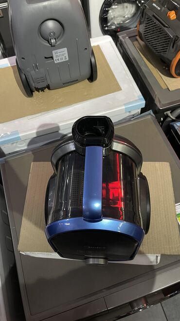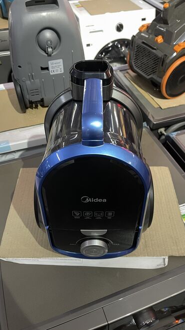 СухаяЭто пылесос марки Midea с современным дизайном в черно-синем цвете. Модель оснащена циклонной системой и высокоэффективным фильтром для качественной уборки. На корпусе имеется регулируемая ручка с переключателем мощности (MIN-MAX) и индикаторы функций, включая большую емкость пылевого контейнера. Пылесос предназначен для эффективной очистки различных поверхностей.