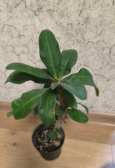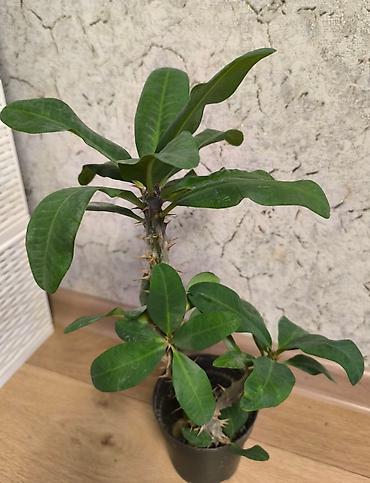 - Комнатный суккулент с мощным колючим стеблем и плотными зелёными листьями по розеткам.