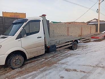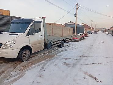 Эвакуатор Mercedes-Benz Sprinter с длинной платформой и прицепом для перевозки нескольких автомобилей.