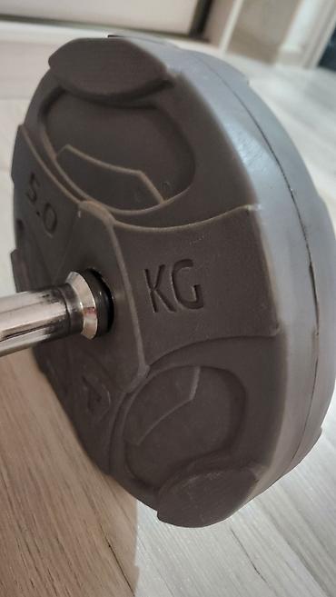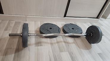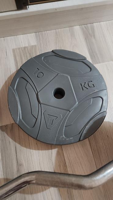 - Гриф: изогнутый (EZ), хромированный, насечка для хвата, резьбовые концы под гайки-фиксаторы.