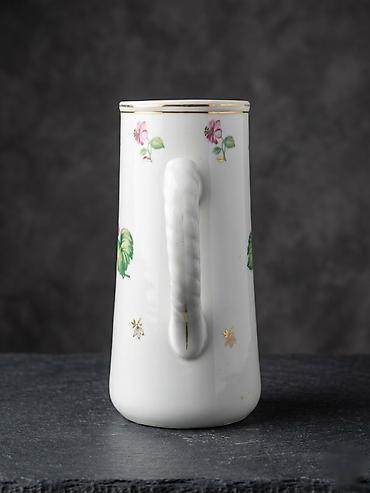 - Декор: цветочная надглазурная роспись с розово-зелёными бутонами и листьям; небольшая золочёная линия по краю горлышка; миниатюрный декоративный элемент в виде пчёлки на корпусе.