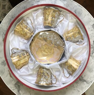 Подходит для сервировки чая, кофе, десертов и как эффектный подарок или элемент декора. Размеры на фото ориентировочные; кружки из набора компактные (эспрессо/капучино), блюдце и отдельная чашка — для стандартной чайной подачи.