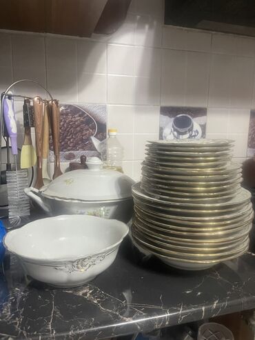 - Стопка обеденных тарелок с золотой окантовкой (много штук, одинаковый рисунок).