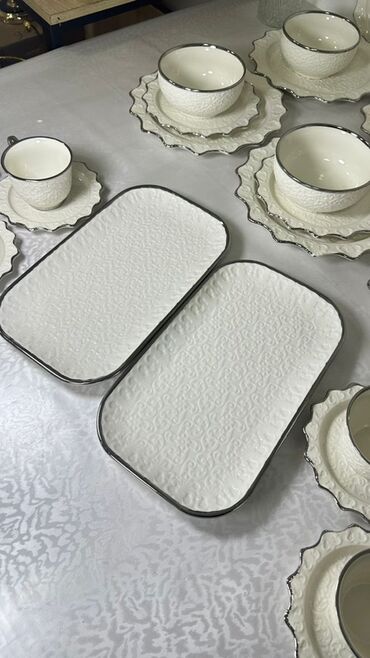Фарфоровый столовый набор, белый с волнистым краем и тонким серебристо-золотистым орнаментом по бортику. Состав набора по фото: - чайник с крышкой; - глубокие круглые блюда/салатники (крупные, 2 ш...