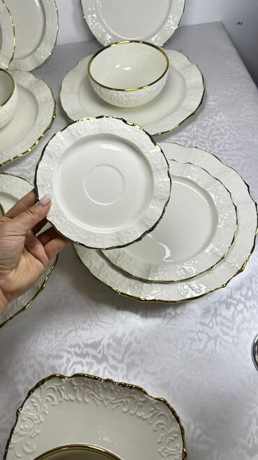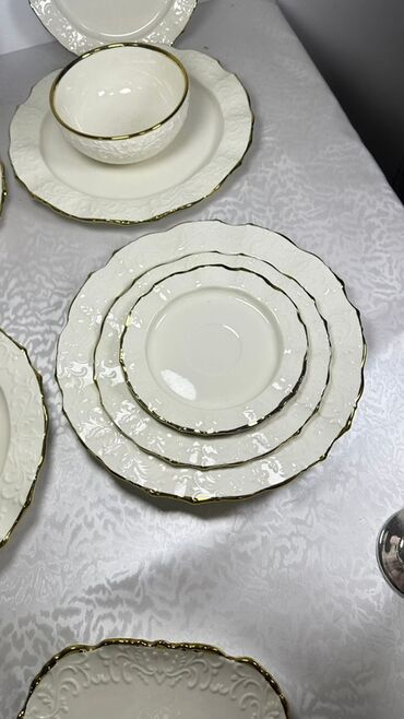 Набор столовой посуды из тонкого фарфора с золотым декором. Состав набора: - глубокая салатница/супница - большое плоское блюдо - плоская сервировочная тарелка среднего размера - десертная тарелка...