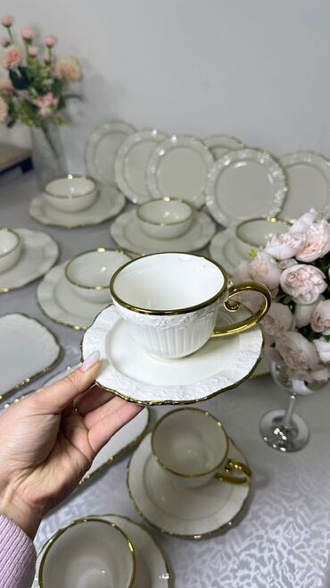 Фарфоровый столовый и чайный сервиз с волнистым контуром и ручной золотой каймой. Особенности: - Материал: тонкий фарфор белого цвета с глянцевой глазурью. - Дизайн: квадратно-скруглённая форма с ...