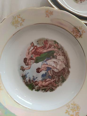 - Декор: многоцветные классические сцены в медальонах, растительные орнаменты, тонкий золочёный кант по краю.