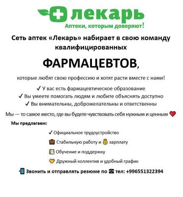 В г. Бишкек (аптеки по всему городу) требуется фармацевт/провизор. * ЗП: 200 сом (выплаты 2 раза в месяц). * График: 5/2 и другие варианты, часы по договорённости. * Оформление по ТК КР. * Можно...