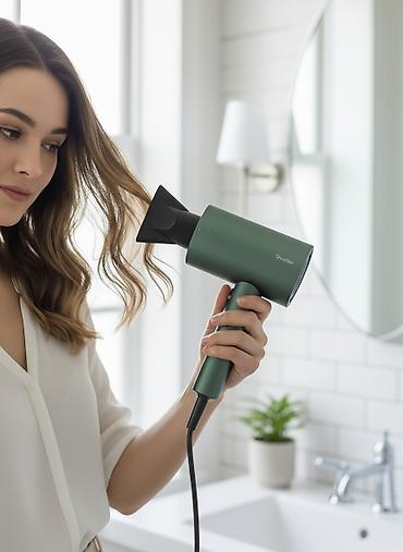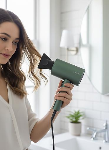 - Компактный фен в современном дизайне, цвет — матовый тёмно‑зелёный.