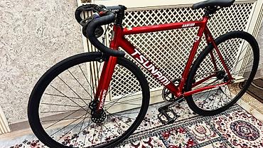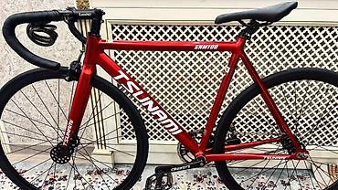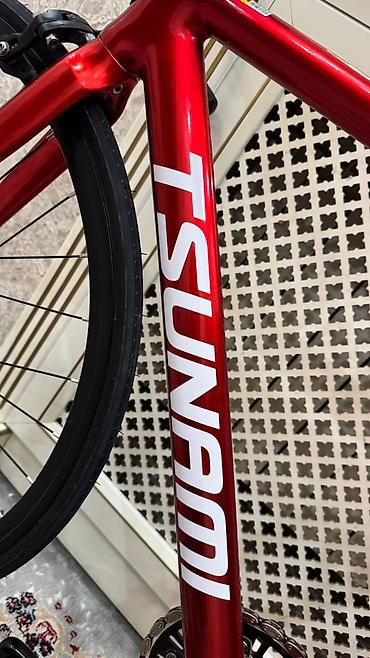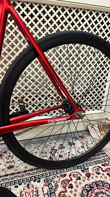 - Рама и вилка: алюминий 6061-T6, геометрия трек/фикс. Цвет — металлик красный с белыми логотипами TSUNAMI.