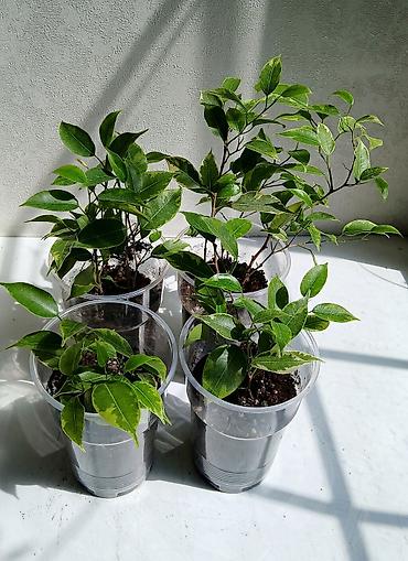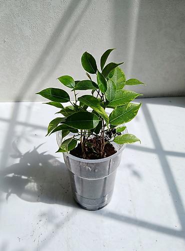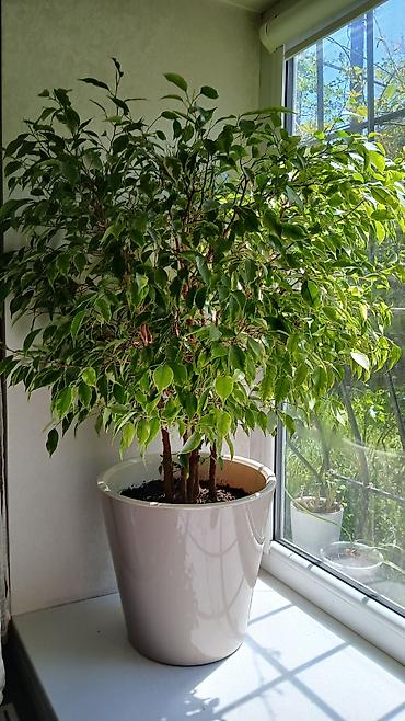 Комнатное растение Ficus benjamina (фикус Бенджамина) в горшке. - Высота растения примерно 45–60 см от уровня почвы. - Листья узкие, глянцевые, тёмно‑зелёные. - Посажен в пластиковый горшок серого...