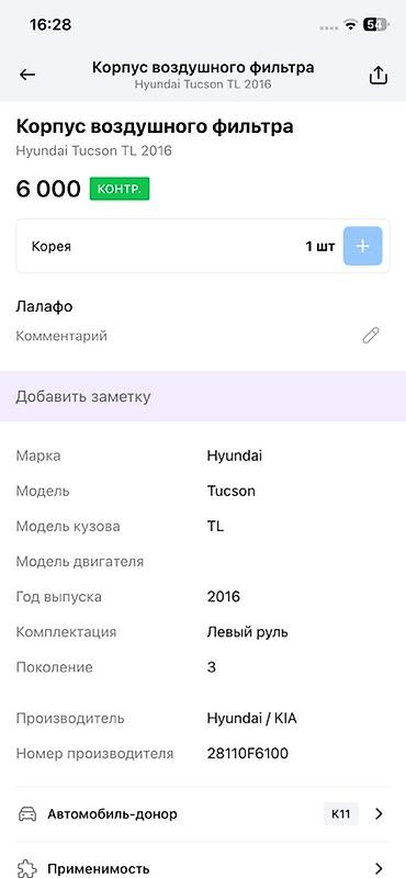 Корпус воздушного фильтра для Hyundai Tucson TL (3‑е поколение), год выпуска 2016. Оригинальный производитель: Hyundai/KIA. Номер детали: 28110F6100. Страна происхождения: Корея. Комплектация: для автомобиля с левым рулём.