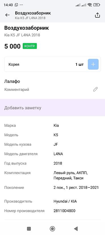 Воздухозаборник (корпус воздушного фильтра в сборе) для Kia K5 JF, двигатель L4NA, год 2018. Оригинальный производитель: Hyundai/KIA. Номер детали: 28110D4800. Подходит для 2-го поколения (1-й рестайлинг 2018–2021), левый руль, АКПП, передний привод, такси.