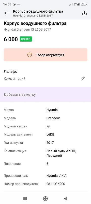 - Подходит для: Hyundai Grandeur (Azera) поколения IG, 2017 г., двигатель L6DB, передний привод, АКПП, левый руль