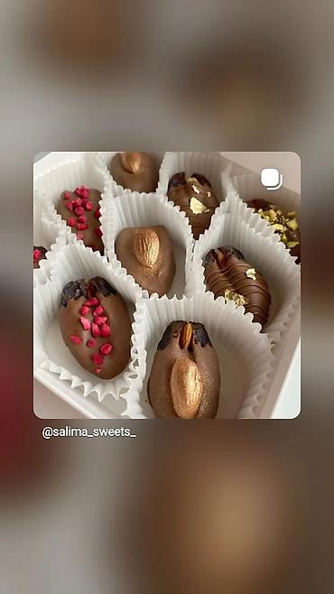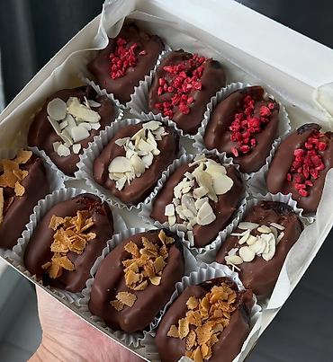 Финики в шоколаде с начинками и топпингами. - Крупные мягкие финики, вручную нафаршированные орехами (миндаль, грецкий орех, пекан и др.). - Покрытие: молочный и тёмный бельгийский шоколад, аккура...