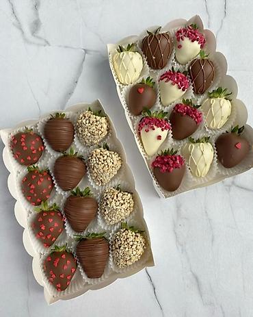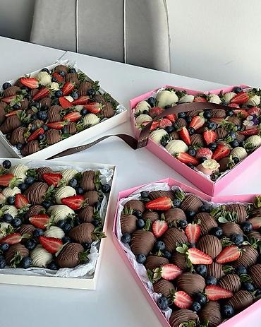 Подарочные наборы десертов ручной работы Состав и оформление: - Клубника в бельгийском молочном и белом шоколаде - коробка -пакет -лента