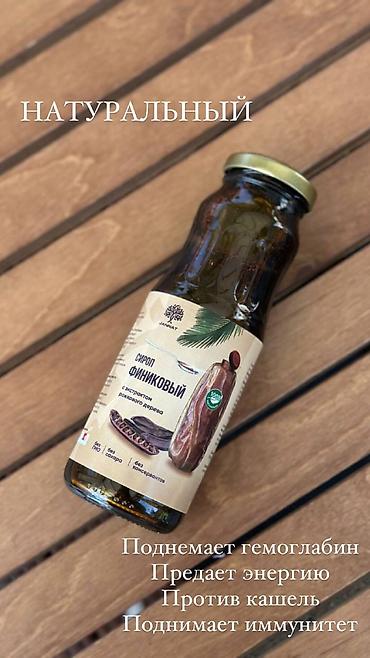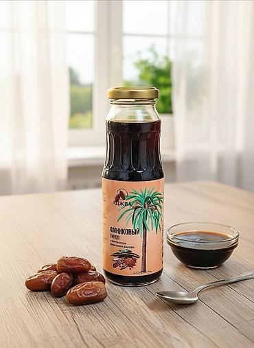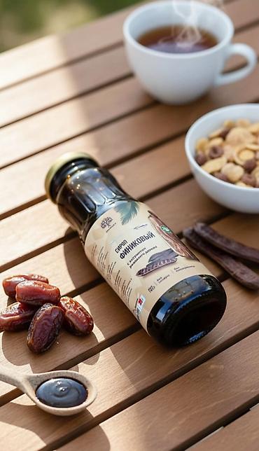 Финиковый сироп в стеклянной бутылке с золотистой крышкой. На этикетке изображена финиковая пальма. Отличная альтернатива сахару для добавления в напитки, выпечку или в качестве топпинга к десертам.