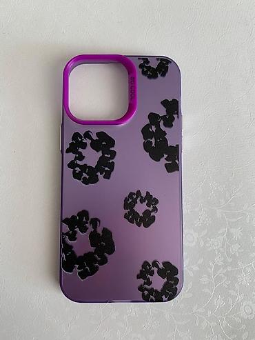 Фиолетовый чехол для Айфон 13/14 , 14 про макс , 15 , 15 про , 15 про макс , с рисунком черных цветочных/кольцевых элементов.