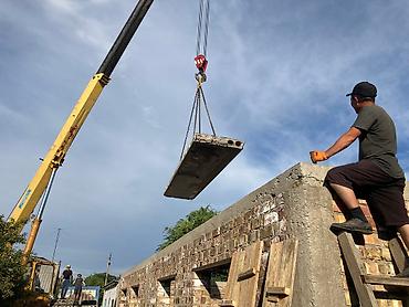 Железобетонные плиты перекрытия Размеры 12 метров длина 3 метра ширина - Материал: тяжелый армированный бетон, внутри стальная арматура; на торцах видны монтажные петли для...