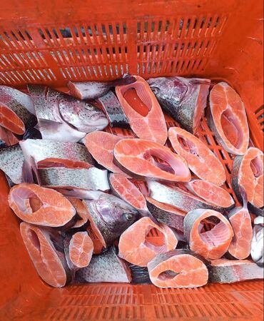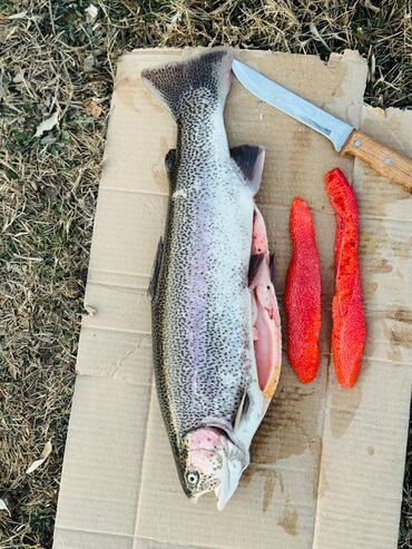 - Целая форель с яркой икрой, а также нарезка стейками.