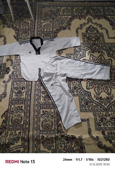 Кимоно для тхэквондо Adidas (добок) - Комплект: куртка с чёрным воротом V-образного кроя и штаны на резинке. - Цвет: белый, чёрный ворот. - Бренд: Adidas (логотипы на куртке и штанах). - На куртке...