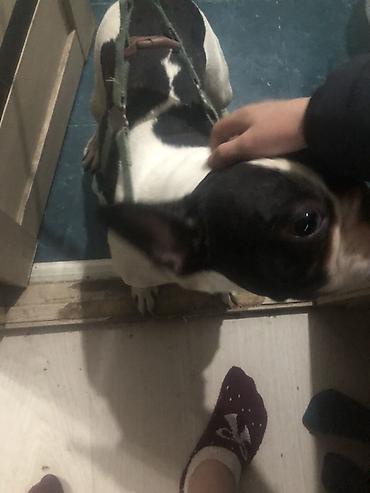 Французский бульдог, чёрно-белый окраc (пегий). Компактный, крепкий, с короткой мордой, крупными стоячими ушами и выразительными глазами. На фото — в шлейке.