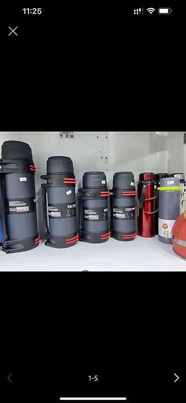 Также на фото — термосы/вакуумные фляги разных объемов (серия Vacuum Travel Pot) с ручками и ремнями для переноски, корпус матовый темно-серый с красными элементами, а также металлические бутылки/термосы (красный, серый, стальной).