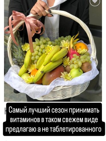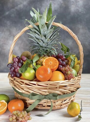 - Наполнение корзин: ананас, мандарины/апельсины, лайм, виноград (красный и белый), бананы, киви, груши, яблоки; возможны акценты экзотикой (питахайя, мангостан и др.) — разнообразие цветов и вкусов.