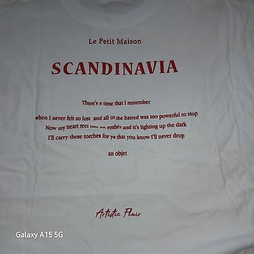 - Принт: небольшой логотип «SCANDINAVIA» спереди слева на груди; крупный принт на спине/полочке с надписью «Le Petit Maison SCANDINAVIA» и текстом на английском, подпись «Artistic Flair».