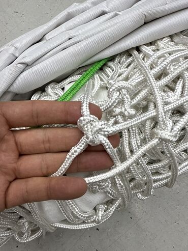 - Конструкция: узловая вязка; квадратная ячейка (примерно 10–12 см по фото); усиленный верхний кант/карман из прочной ткани для продевания перекладины/штанг.