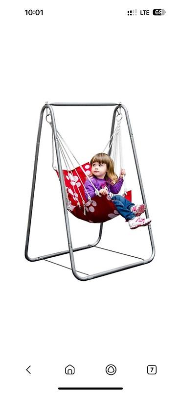 - Комплектация: тканевое кресло‑гамак, прочные шнуры/подвесы, металлический напольный каркас