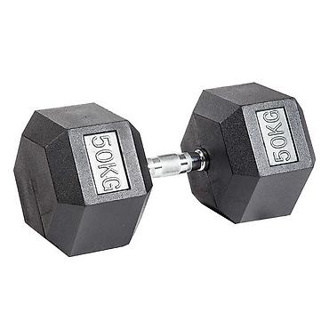 Пара черных гантелей весом 50 кг каждая. Гантели имеют многогранную форму, что предотвращает их скатывание. Ручки гантелей с насечками для надежного хвата. Подходят для силовых тренировок в домашних условиях или в спортзале.