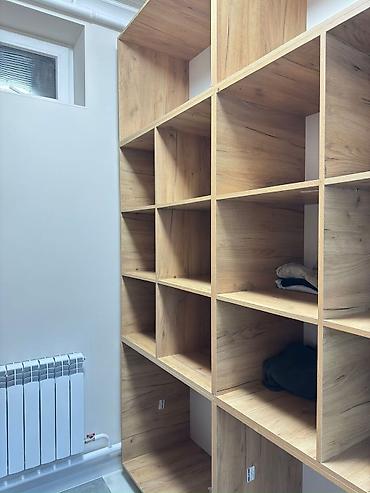 - Секции с открытыми полками разной высоты и глубины для сложенных вещей и коробов.
