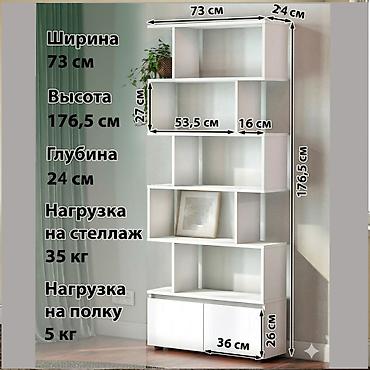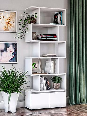 - Конфигурация: каскадные открытые полки разной высоты и ширины, нижняя секция — тумба с распашными дверцами (высота модуля 26 см, ширина каждой двери 36 см).