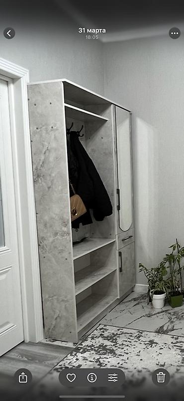 - Компоновка: открытая секция с верхней полкой и 4 металлическими крючками для верхней одежды; три открытые полки снизу (удобны для обуви/коробов); узкий шкаф с распашной дверцей и вертикальным зеркалом на фасаде; выдвижной ящик под зеркалом.