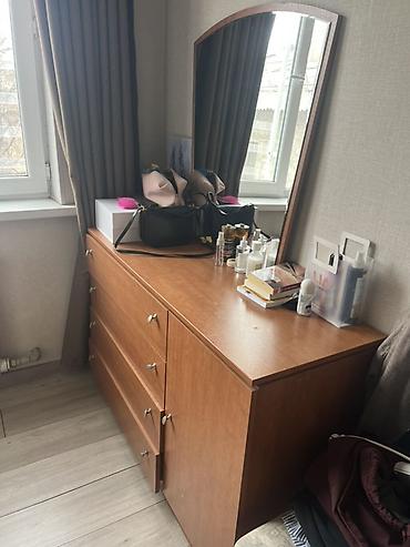 - Комод/туалетный стол с высоким зеркалом полукруглой формы. Три выдвижных ящика слева и тумба с дверцей справа. Цвет — тёплый орех.