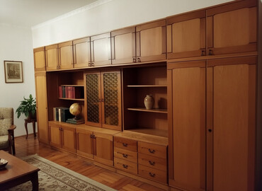 Гостиная стенка/модульный шкаф с витринами и местом под ТВ. В хорошем состоянии. Хочу интерьер поменять. - Компоновка: два высоких шкафа-витрины по бокам, центральный модуль с нишей под телевизор...