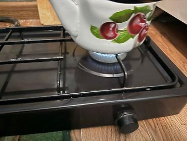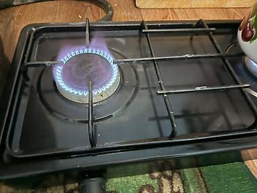 - Настольная плита на 2 конфорки, металлическая решётка, механические поворотные ручки управления.