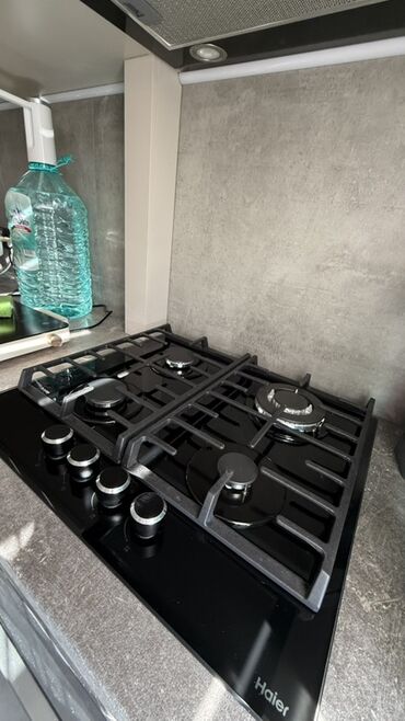 Газовая варочная панель Haier, 4 конфорки на стеклокерамической поверхности черного цвета.
